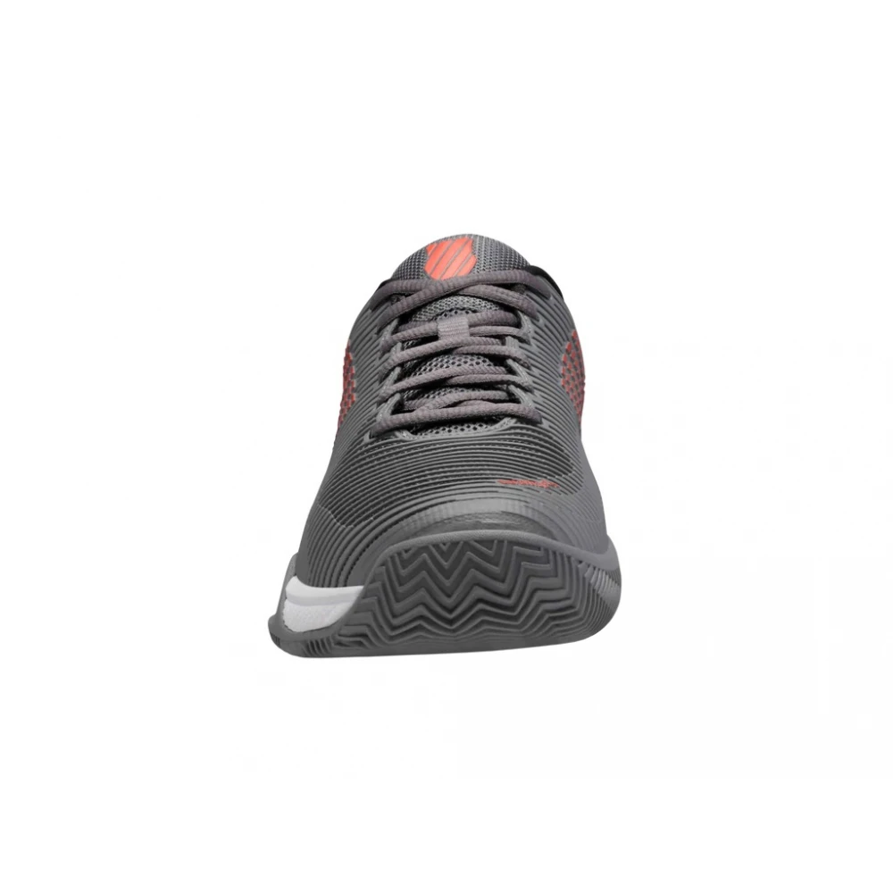 The K-Swiss Men’s Hypercourt Express 2 HB Tennis Shoes (Steel Gray/Jet Black/Spicy Orange) feature a deep grooved herringbone outsole for exceptional traction on clay court surfaces.
